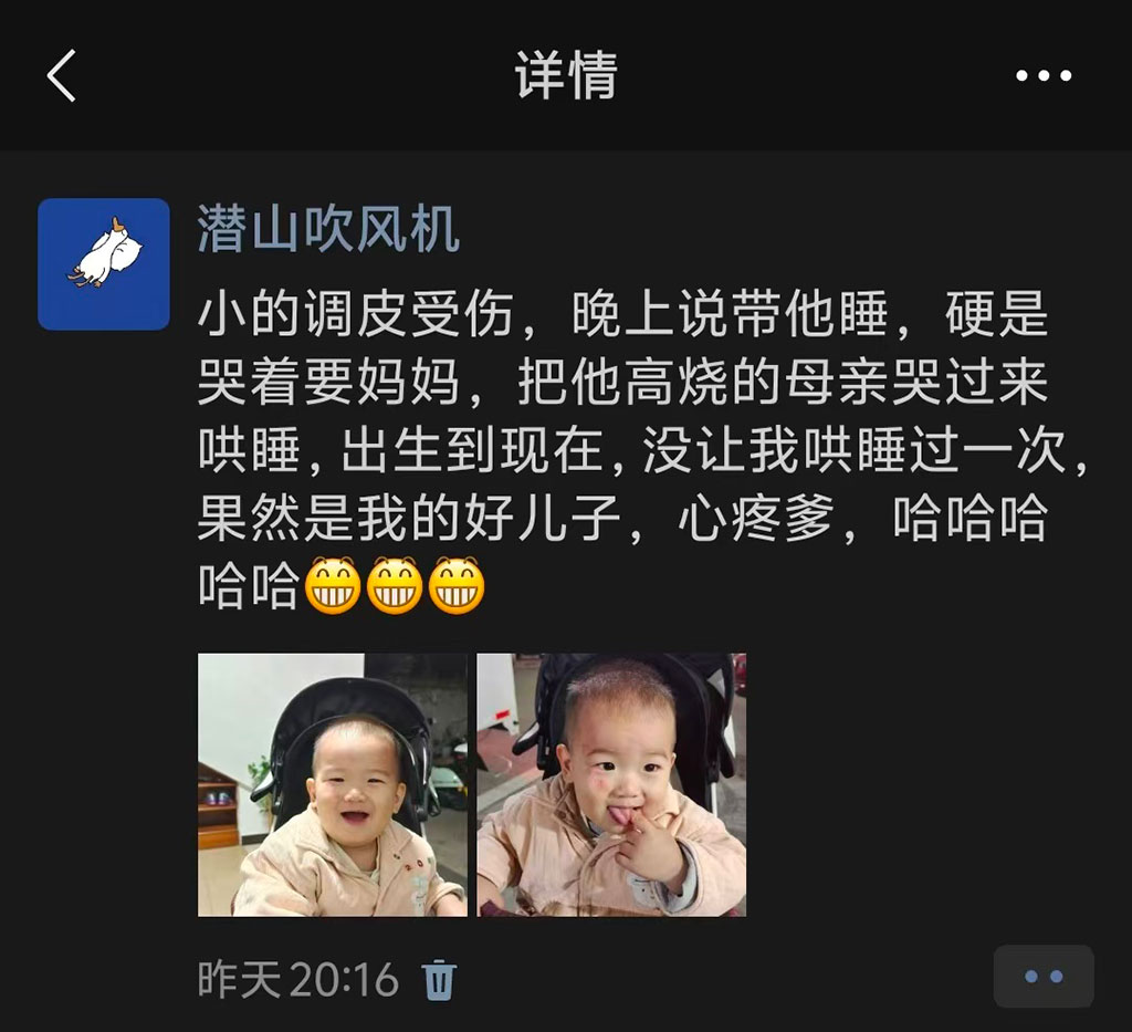 这娃从出生,确实也没让我带过睡觉,所以一直吵着要妈,后面我带着睡觉,到处翻,最终还是老婆带着睡了,赶紧再发个朋友圈,虽然是调侃,还不是给老婆看,让她心安~
